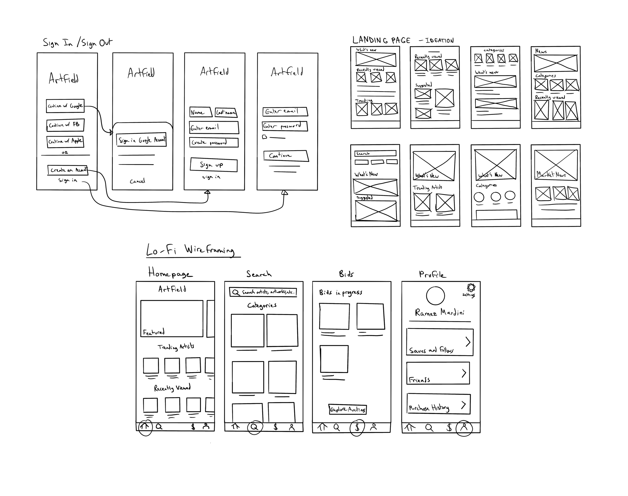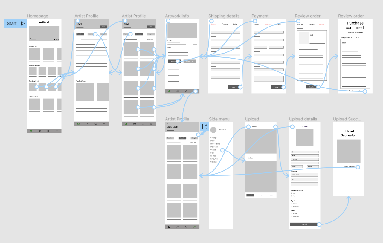 This low-fidelity prototype showcases the process of buying an artwork on the app and selling an artwork. This prototype would later be used to test it on a select group of users