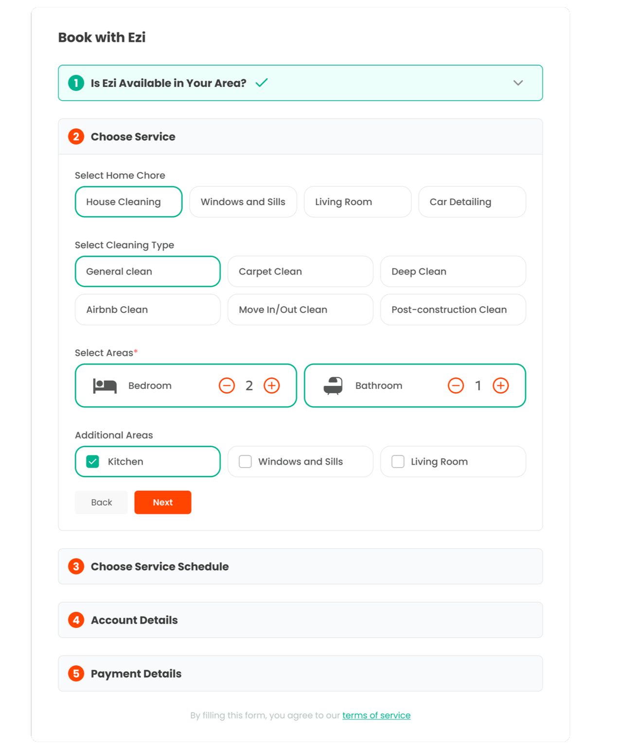 To simplify and shorten the booking flow, I merged three separate steps—chore type, cleaning type, and areas that need cleaning—into a single, cohesive section, with each chore type having its own respective service selections. This helped: